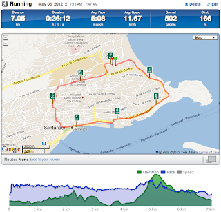 Doble sesión de entrenamiento durante la jornada de ayer y esta vez por asfalto. Una reunión de empresa ha sido la causa de este cambio en la planificación habitual. Por la mañana 7 Km con el grupo de Corriendo en Santander, donde hemos subido la cuesta de la Atalaya (probablemente la más dura de la ciudad) y por la tarde he salido a correr por Bilbao con un compañero de trabajo cerca del Guggenheim.